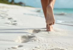 신발을 벗고 맨발로 흙길, 잔디밭, 해변을 걷는 사람들.